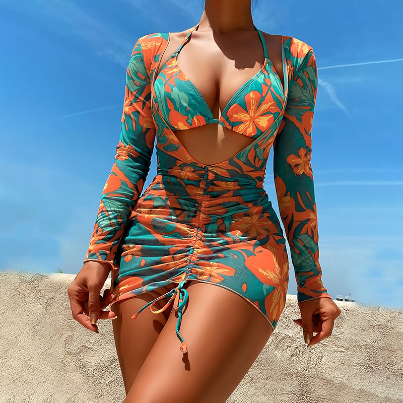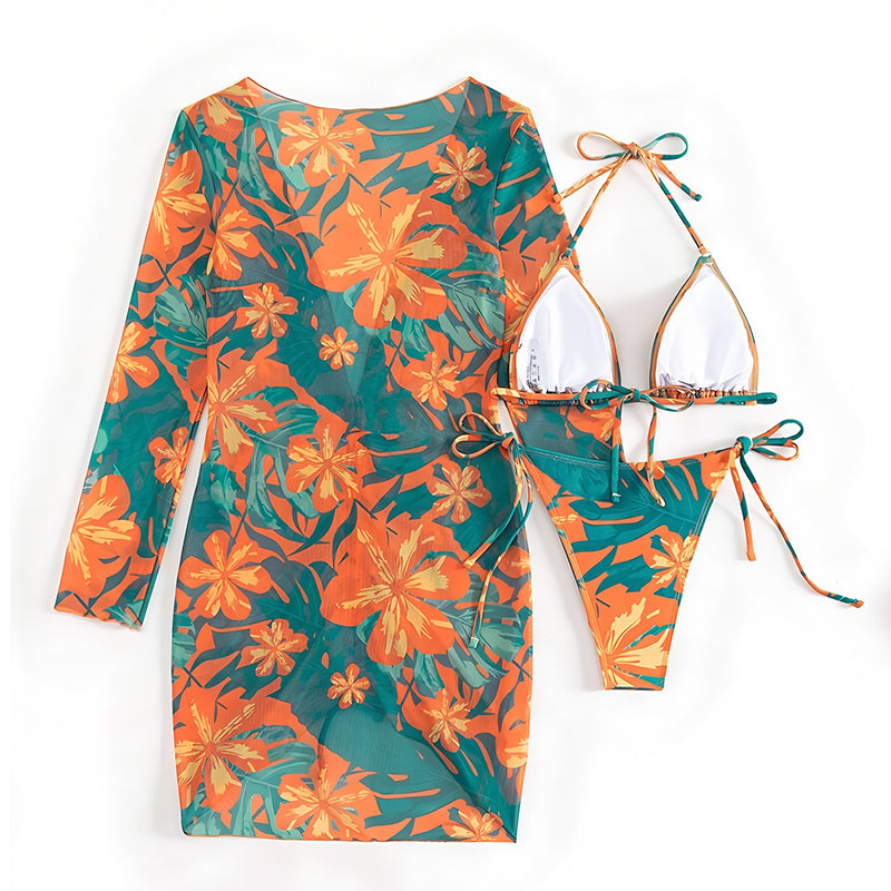 3-PIECE VERSATILITY - This set includes a classic triangle bikini and a matching long-sleeve cover-up, offering multiple styling options for a complete and coordinated beach look from sunbathing to seaside strolls.