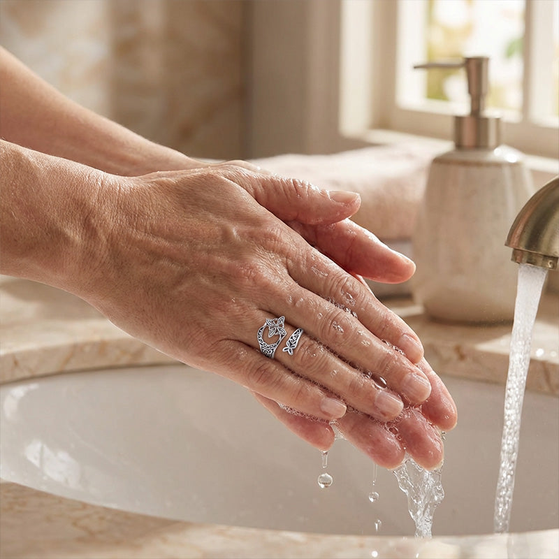 Aby si prsten zachoval svůj lesk, vyhněte se kontaktu s agresivními chemikáliemi, jako jsou parfémy, krémy a chlor.