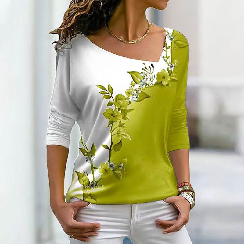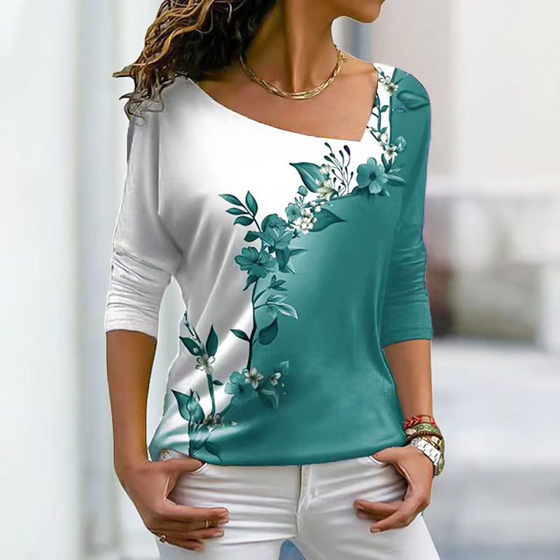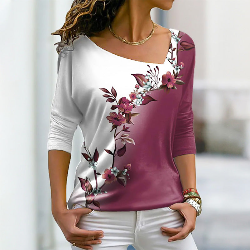 1 * Női V-nyakú, virágmintás, színes blokkos, hosszú ujjú póló